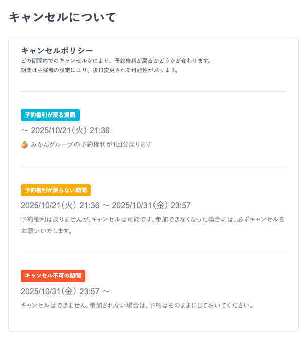 「予約権利が戻る期間」にキャンセル頂きますと、予約権利が戻り再度他のイベントを予約可能になります。