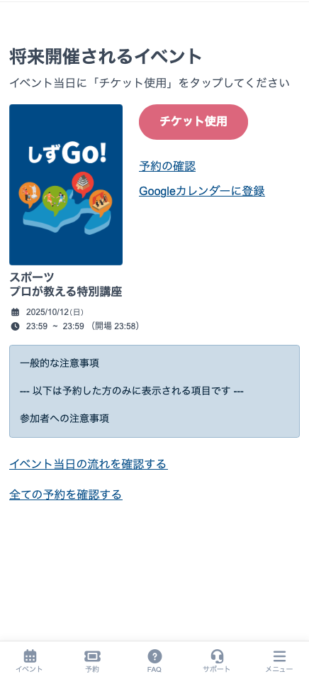 イベント当日は「予約」画面から、画面上で表示できるチケットを提示して入場(またはチケットのお引き換え)頂きます。