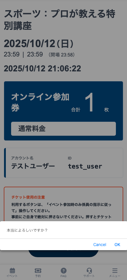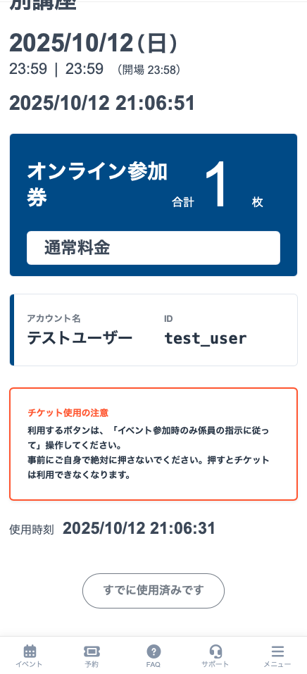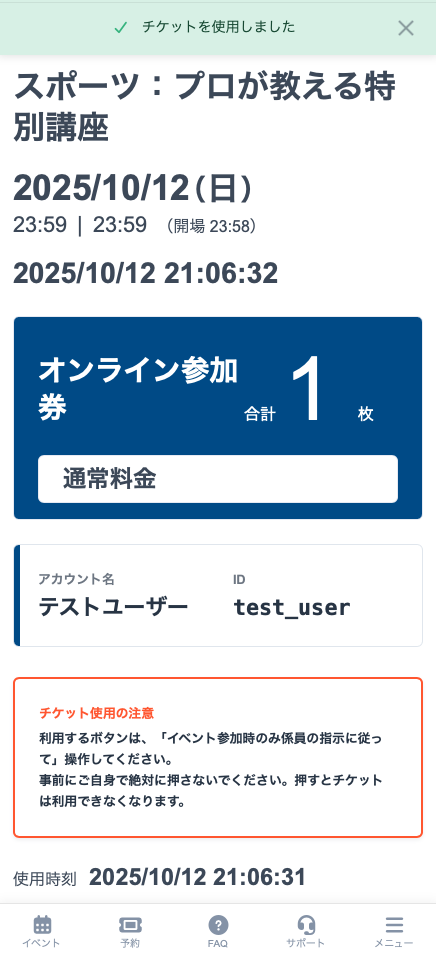 チケットの使用を確認します。イベントをお楽しみください。